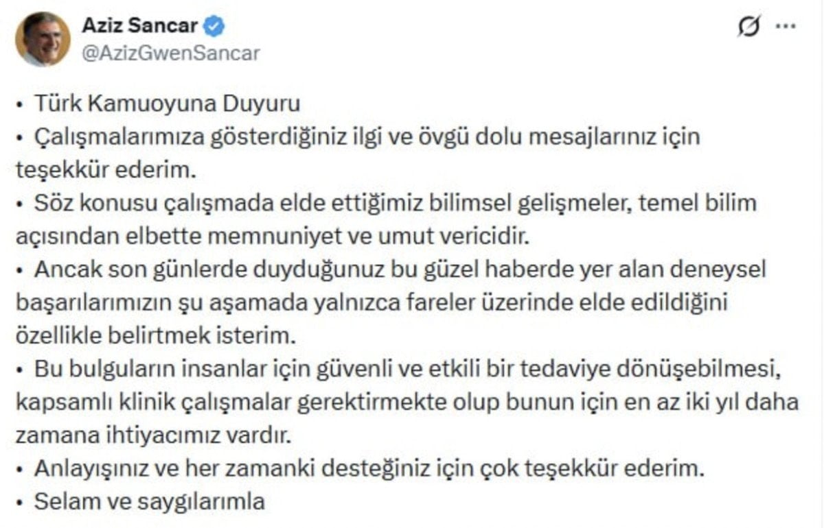 Çalışmalarımıza gösterdiğiniz ilgi ve desteğiniz için teşekkür ederim. Elde ettiğimiz bilimsel ilerlemeler, umut verici olsa da, bu aşamada yalnızca fareler üzerinde yapılan deneylerdir. İnsanlar için güvenli ve etkili bir tedavi olabilmesi için detaylı klinik çalışmalar ve en az iki yıl daha zamana ihtiyaç vardır. Anlayışınız ve desteğiniz için teşekkür ederim. Saygılarımla.