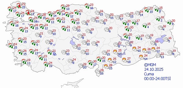 24 Ekim Cuma günü Türkiye genelinde yağışlı bir hava bekleniyor. Güneydoğu Anadolu, İç Anadolu ve Akdeniz’in bazı bölgeleri dışında yağışlı bir hava etkili olacak. Meteoroloji Uzmanı Prof. Dr. Orhan Şen, İstanbul için cuma akşamı şiddetli yağışların beklendiğini belirterek vatandaşları su baskınları konusunda uyardı.