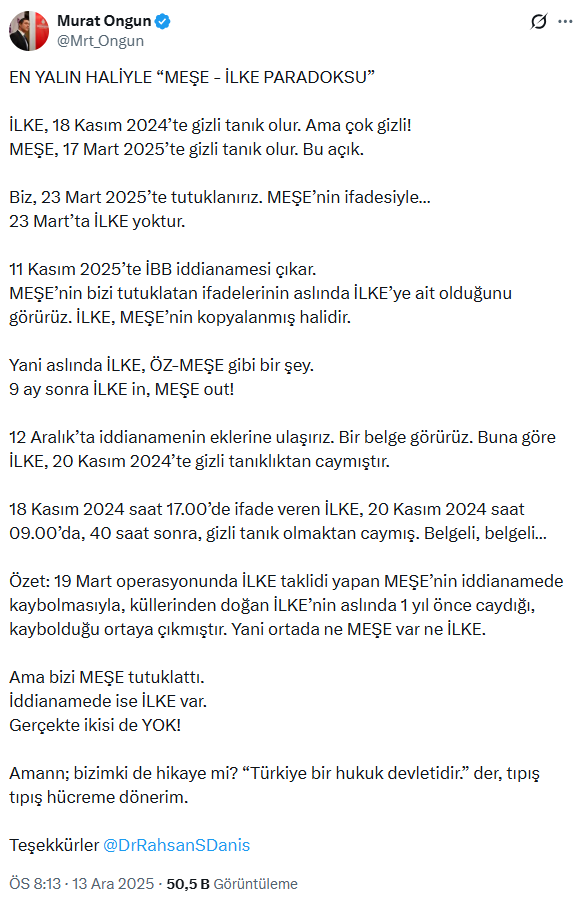 İBB dosyası kapsamında tutuklu bulunan İBB Medya AŞ Yönetim Kurulu Başkanı Murat Ongun, İBB soruşturması kapsamında çok sayıda kişinin tutuklanmasına neden olan gizli tanık çelişkisine ilişkin paylaşımda bulundu.