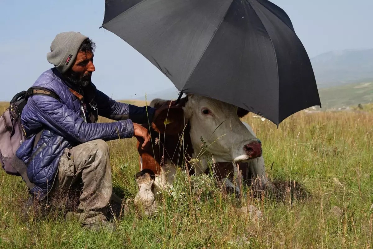 Ardahan’ın Damal ilçesinde şap hastalığı ve aşırı sıcaklar hayvancılığı olumsuz etkiliyor. Üreticiler, merada hayvanlarını şemsiye ile güneşten koruyor, elleriyle besliyor.