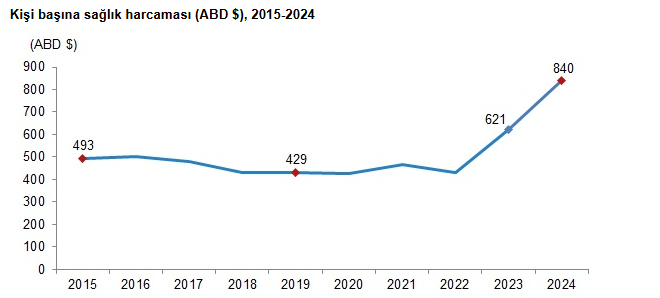 Toplam sağlık harcamasının GSYH’ye oranı 2023 yılında %4,6 iken, 2024 yılında %5,3 oldu. Cari sağlık harcamasının GSYH’ye oranı 2023 yılında %4,2, 2024 yılında %4,9 olarak hesaplandı.