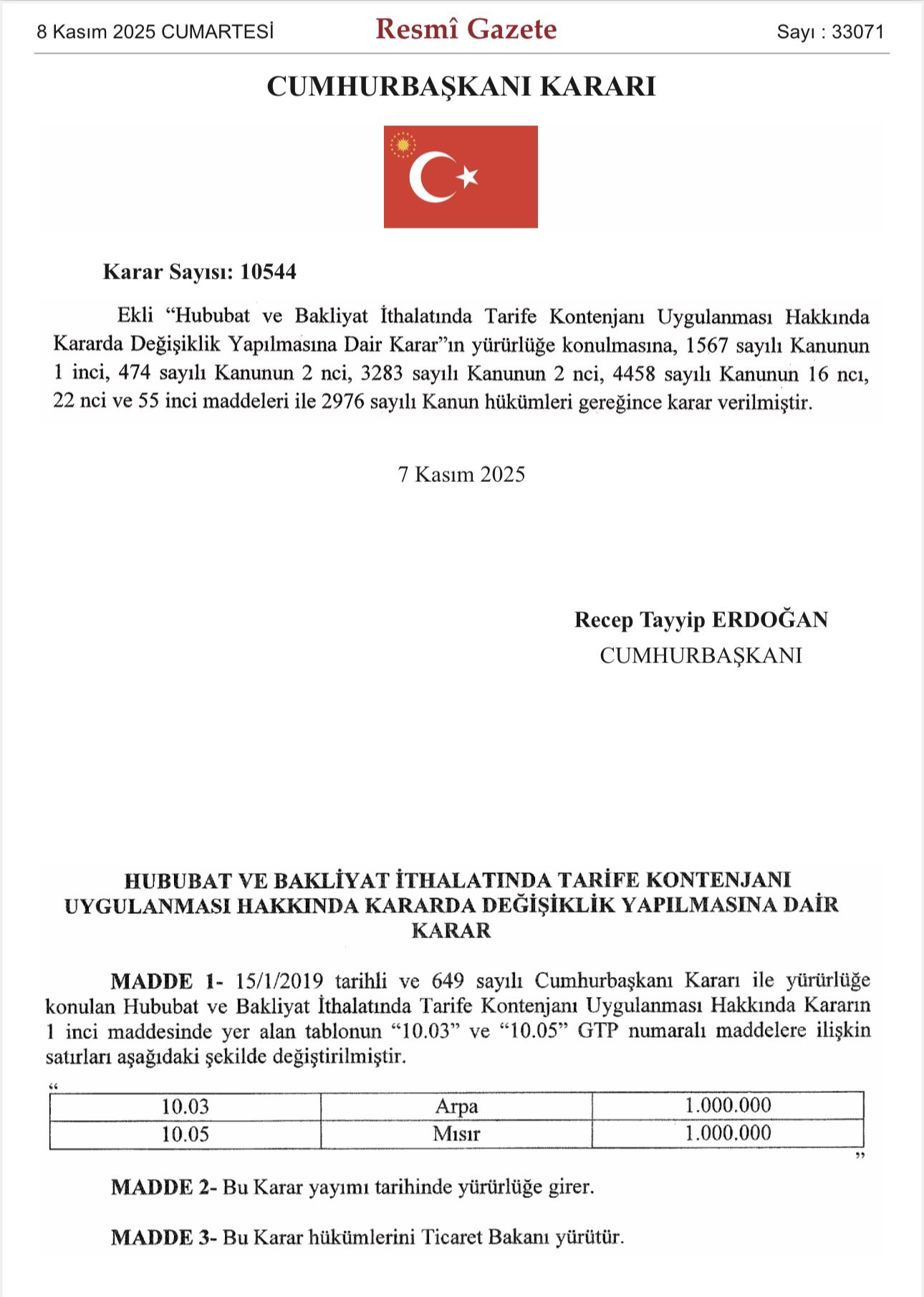 Buna göre, arpa ve mısır ithalatında tarife kontenjanları 700 bin tondan 1 milyon tona çıkarıldı.