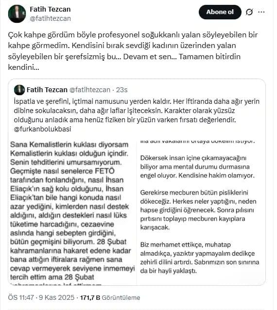 Bölükbaşı’nın bu çıkışından hemen önce, 9 Kasım’da, Atatürk ve Cumhuriyet karşıtı söylemleriyle bilinen Fatih Tezcan ile kamuoyu önünde yaşadığı sert ve seviyesiz tartışma, içinde bulunduğu gerilimi gözler önüne serdi.